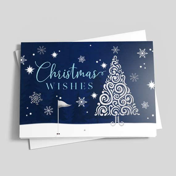 Snow falls on the green of this golf-themed Christmas card. It's evening; against the midnight blue background, you'll see the silhouettes of trees off in the distance. The flag of the hole stretches out in the wind. The message reads 'Merry Christmas' in icy blue letters. The back of the card is midnight blue.
