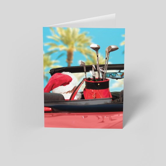 It's a lovely day for playing golf, and Santa couldn't agree more! He's cruising down the coast in his red convertible with the top down, sunglasses on, and his clubs in the passenger seat.