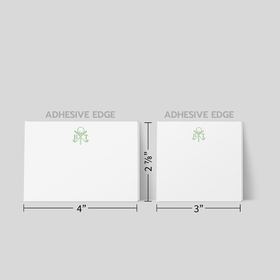 This Post-it® Note design features two crossing golf clubs at the top in green with a golf ball and golf tee in shades of green. There is space to include your first and last initial inside the design. Add additional customizations like a logo or photograph. Each Post-it® Note pad comes with 50 sheets. Choose from two different sizes that include 3" x 3" or 4" x 3".