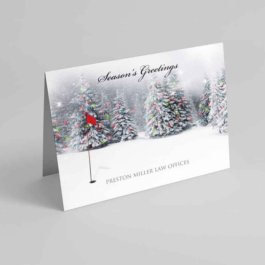 This golf-themed holiday card features a snowy woodland golf course on the front; the trees are decorated with colorful ornaments and, on the green, a red golf flag waves in the wind. The message at the top reads, 'Season's Greetings' in stylish black script. Add your name, company name, or a short personalized message below. The back of the card includes a snowy white background white specks of light. Choose from different paper types, sizes, and add additional customizations like a message, photograph, or logo.