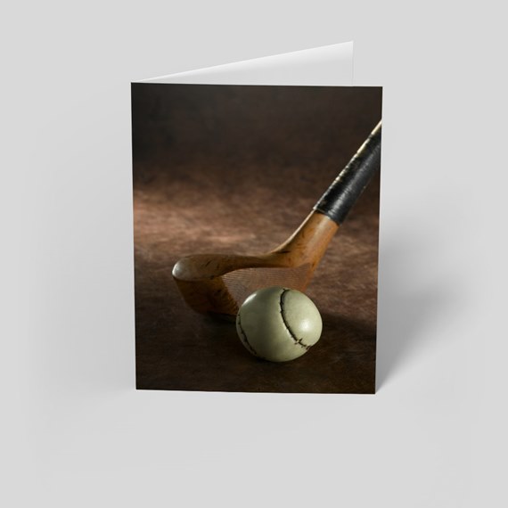 The front of this custom card features a classic golf wood and feather golf ball against a background with black and brown tones. The interior of the card is blank. Choose from different paper types and sizes, then add your customizations.